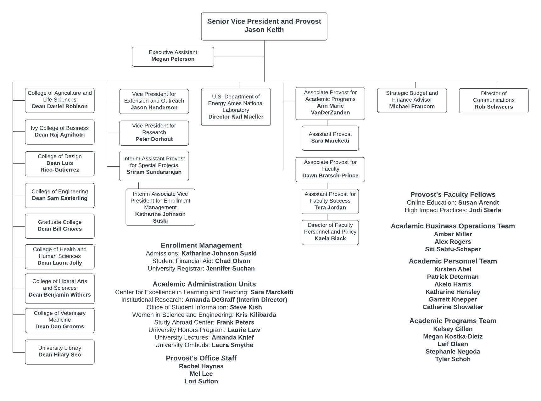 The Office of the Senior Vice President and Provost, reporting to the President, is responsible for Iowa State University's land-grant academic mission in education, discovery, and service.